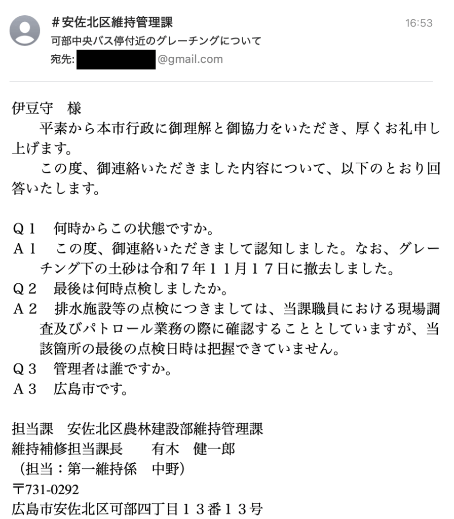 可部中央-バス停【広島市安佐北区】維持管理課からの回答 2025 11/27 広島市政 安佐北区 11/20/202511/27/2025 広島市安佐北区 グレーチングについての回答 グレーチング窒息4【広島市安佐北区】可部中央-バス停11/13 あわせて読みたい 深川入り口交差点【広島市安佐北区】維持管理課からの回答 https://www.youtube.com/live/1wPqrFjpDXs?si=5Y5JJDkrmwT3pJY- グレーチング窒息4【広島市安佐北区】11/13 https://hirosima0110.news/grating-box/ https://hirosima... 広島市政 安佐北区 グレーチング 安佐北区 よかったらシェアしてね! URLをコピーしました! URLをコピーしました! 【翔洋テニスコート】避難通路は通勤者の駐輪場なの?黙認する広島市の現状 可部公民館【安佐北区総合福祉センター】国旗不掲揚について(回答) この記事を書いた人 izumori 関連記事 【広島市発注工事】のゴミ?触れない調査しない訳とは? 12/01/2025 広島市【グレーチング詰まり】住民からの通報待ち? 12/01/2025 深川入り口交差点【広島市安佐北区】維持管理課からの回答 11/27/2025 可部公民館【安佐北区総合福祉センター】国旗不掲揚について(回答) 11/20/2025 【翔洋テニスコート】避難通路は通勤者の駐輪場なの?黙認する広島市の現状 11/12/2025 安全の象徴【長束小学校】校門前の外側線が復活-数年間放置されていた理由は? 11/10/2025 市民指摘で改善完了【点字ブロック】駐車障害が改善!広島市からの回答とは? 11/10/2025 街を違法看板で汚す【公衆衛生推進協議会】多額の補助金は有害無益 10/01/2025